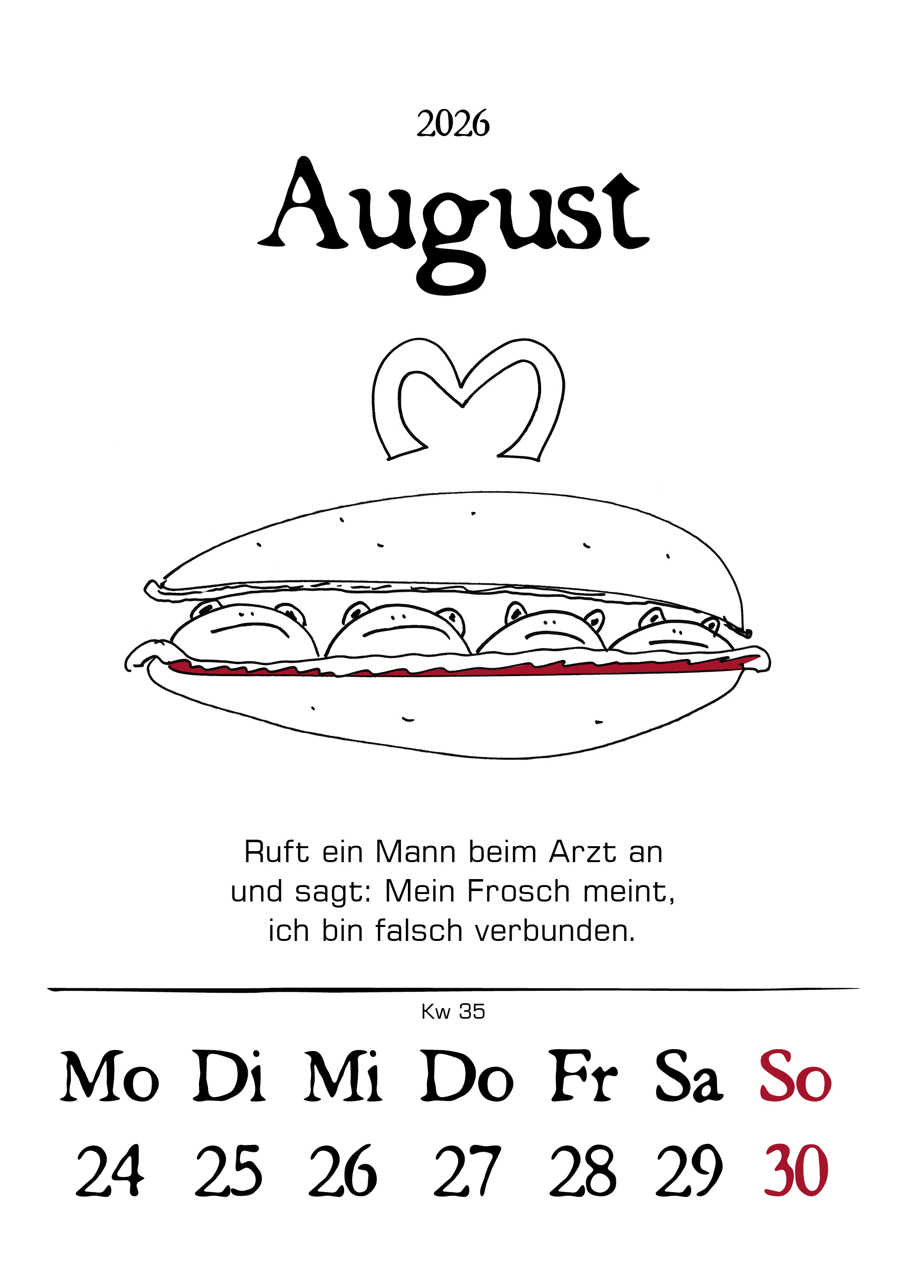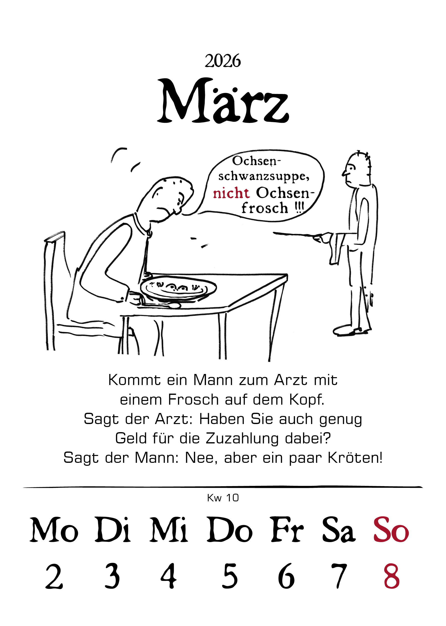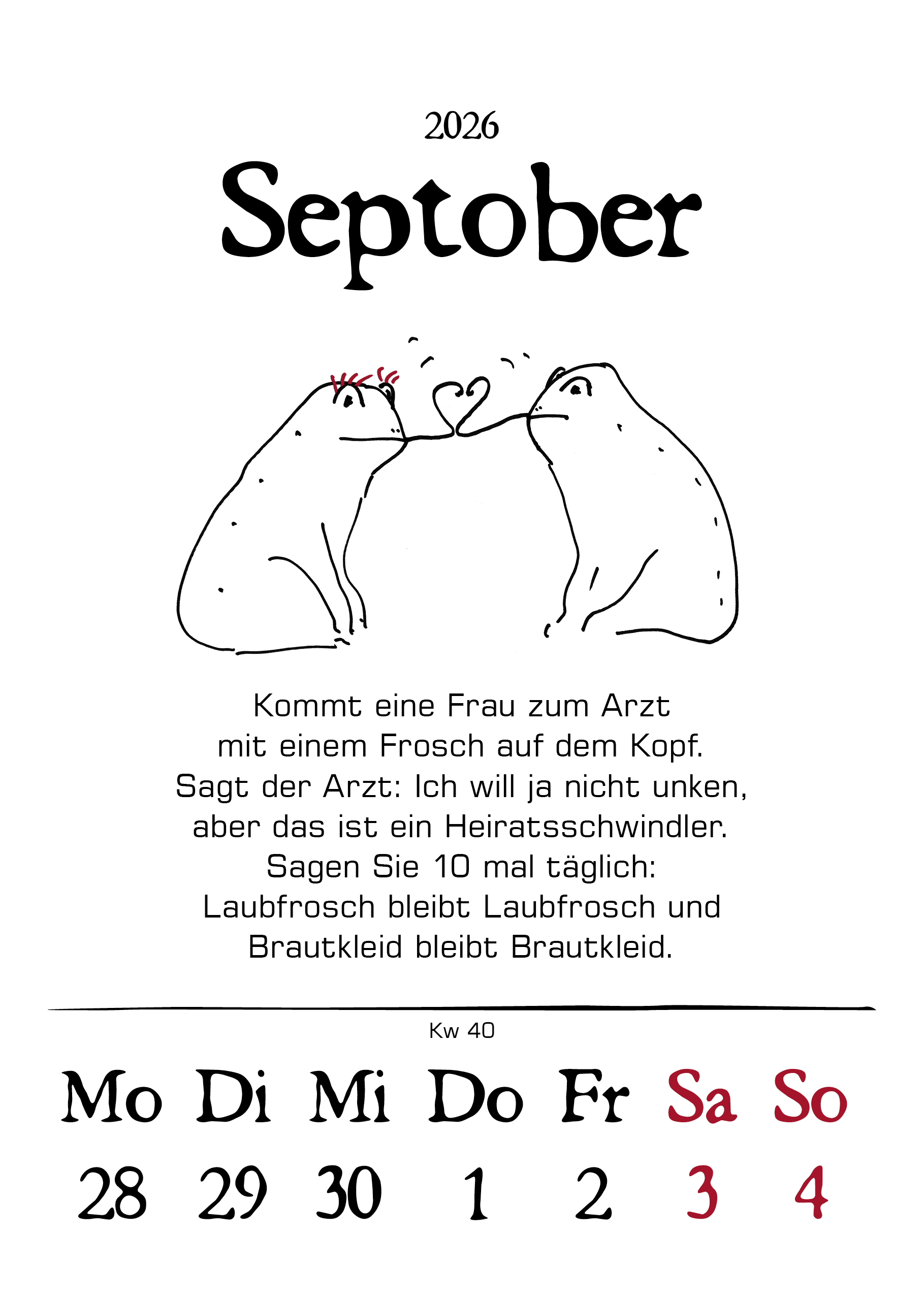 Eine legendäre Bühnennummer der Beiden ist ihr Streit um den richtigen Froschwitz. Daraus entstand die Idee zu diesem Kalender: 53 Variationen des Originalwitzes für 53 Wochen - das wird ein sehr lustiges Jahr.